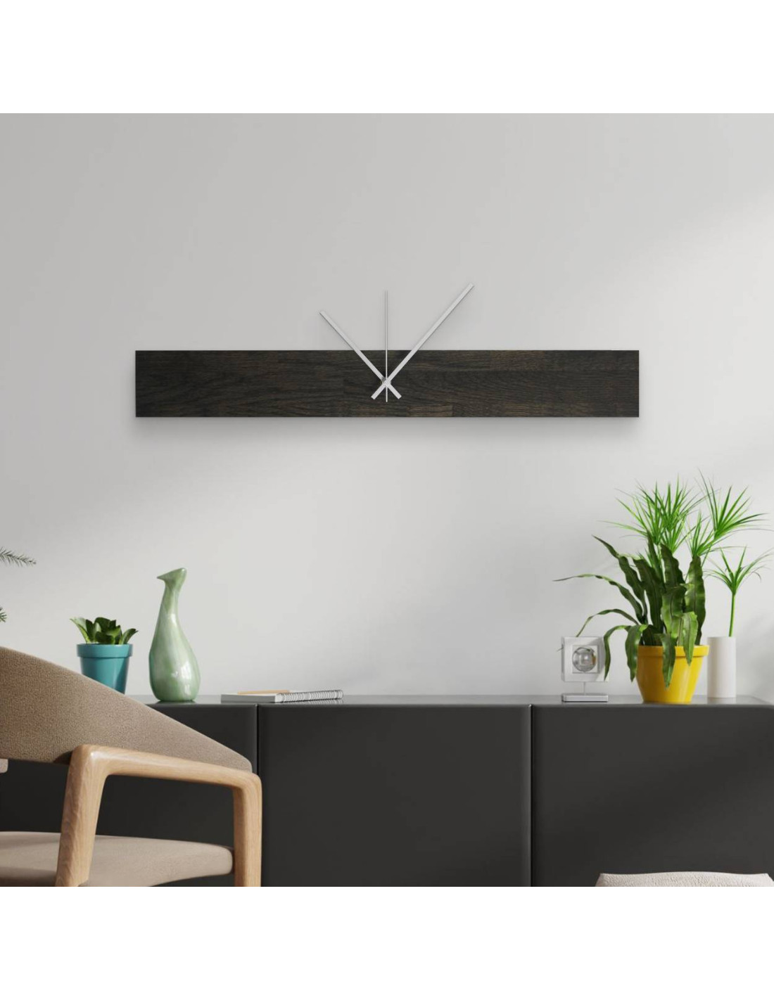 Nowoczesny drewniany zegar ścienny o eleganckiej sylwetce.
