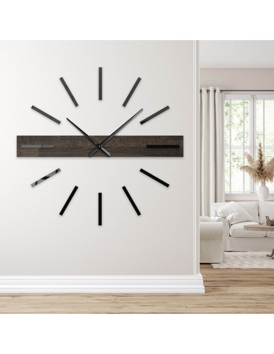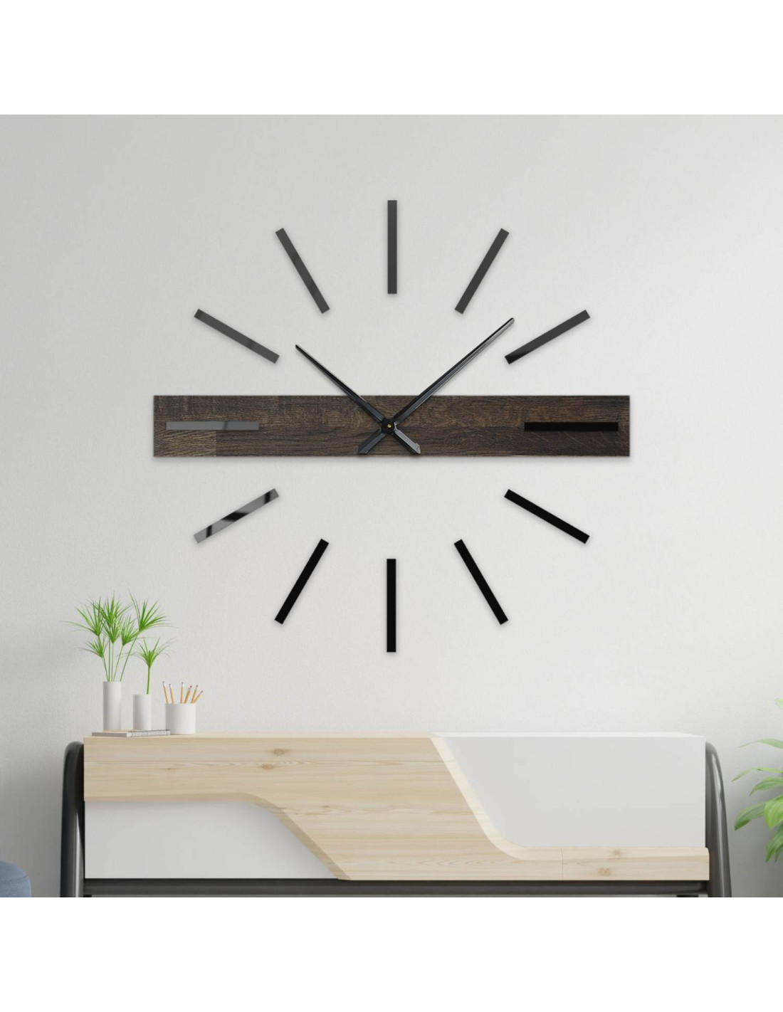 Eleganckie , czarne pałeczki z pleksiglasu i stylowe metalowe wskazówki tworzą nowoczesny kontrast.