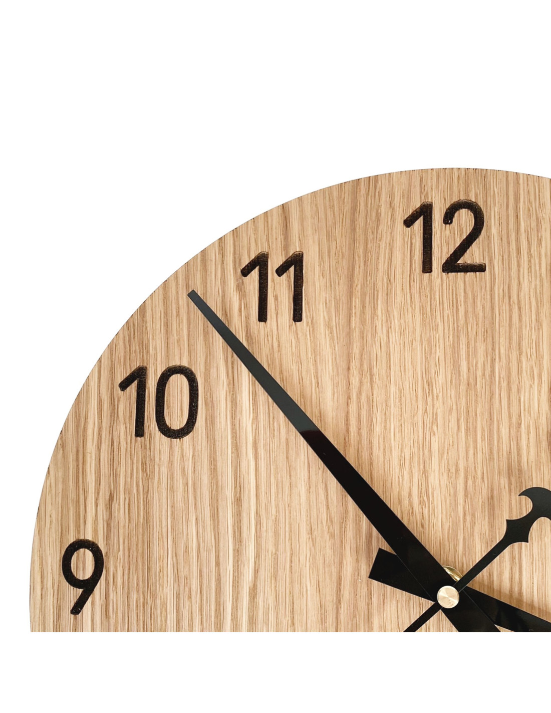 Naturalne piękno drewna dębowego w połączeniu z eleganckimi, czarnymi wskazówkami tworzy subtelny i nowoczesny wygląd. Zegar idealnie komponuje się zarówno z rustykalnymi, jak i minimalistycznymi wnętrzami, wnosząc do wnętrza harmonijny element wizualny.