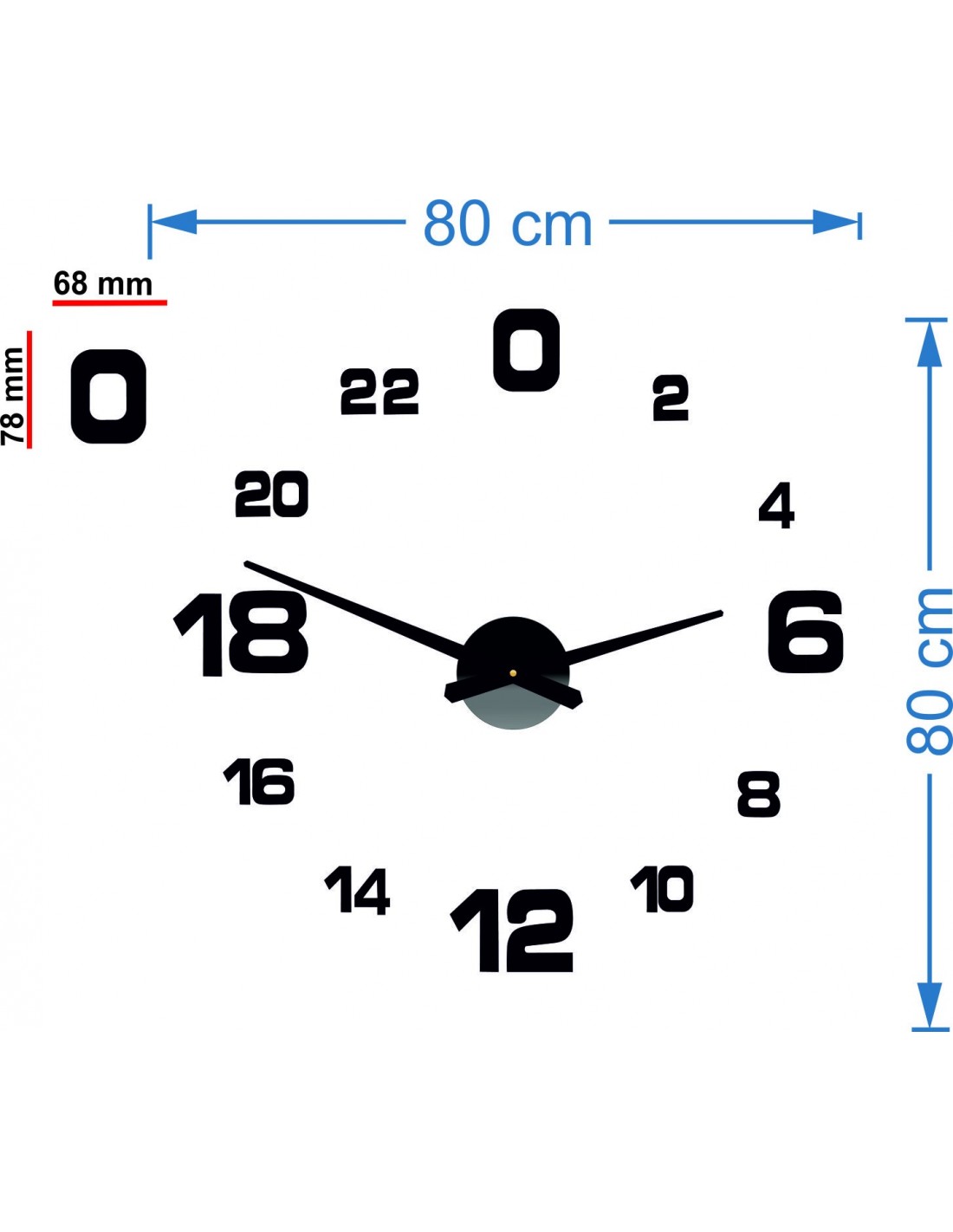 Minimalne wymiary naklejki: 800 x 800 mm, możliwość powiększenia do 1300 x 1300 mm. Wymiary mechanizmu zegarowego: 100 x 100 mm. Długość wskazówek: 30 - 40 cm.