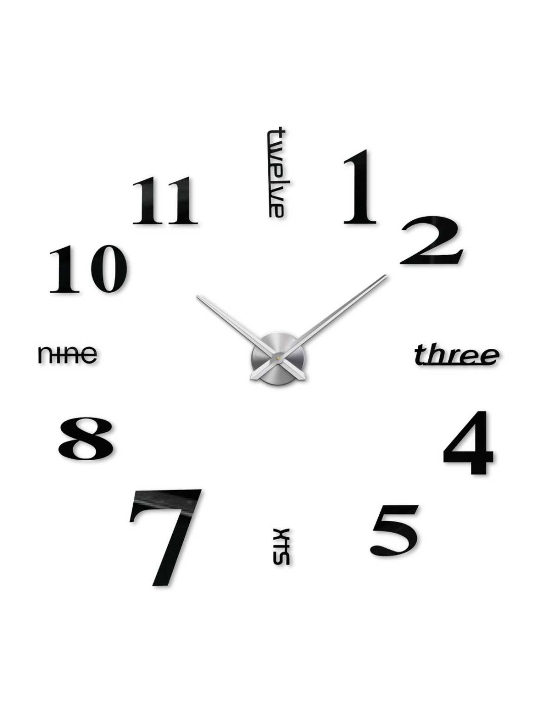 Zegar ścienny o nowoczesnym designie łączy w sobie duże cyfry i pisemne oznaczenia czasu.