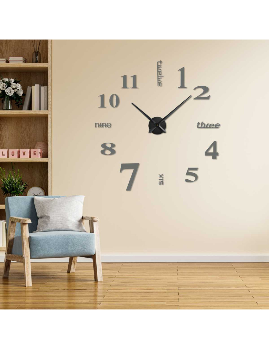 Zegar ścienny o nowoczesnym designie łączy w sobie duże cyfry i pisemne oznaczenia czasu.