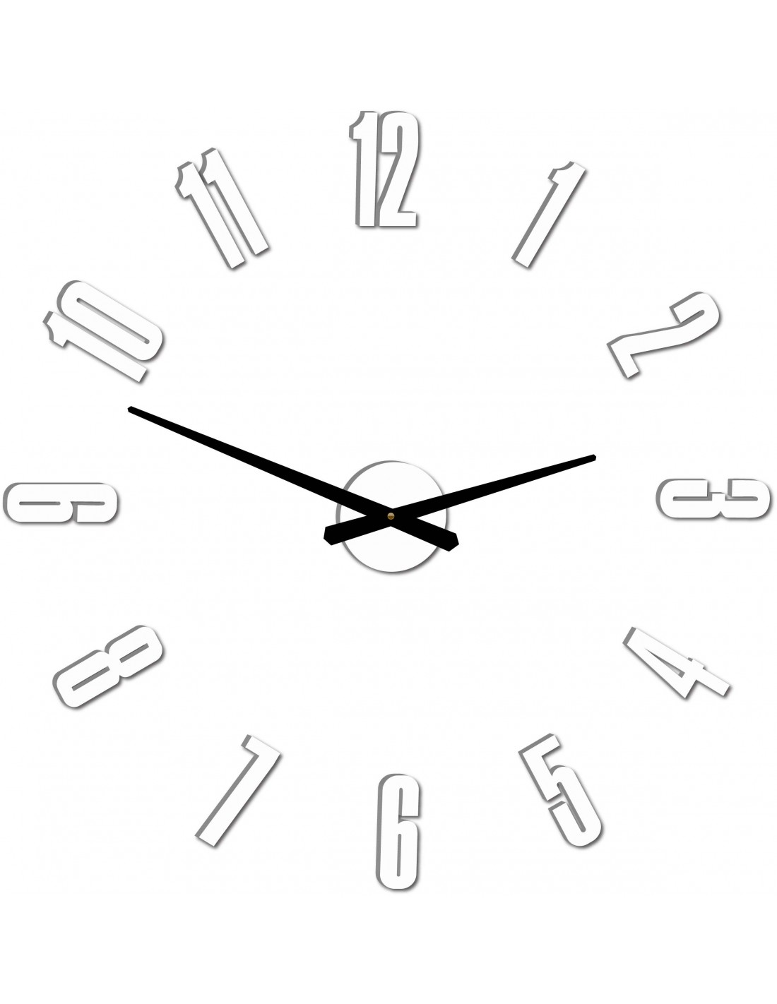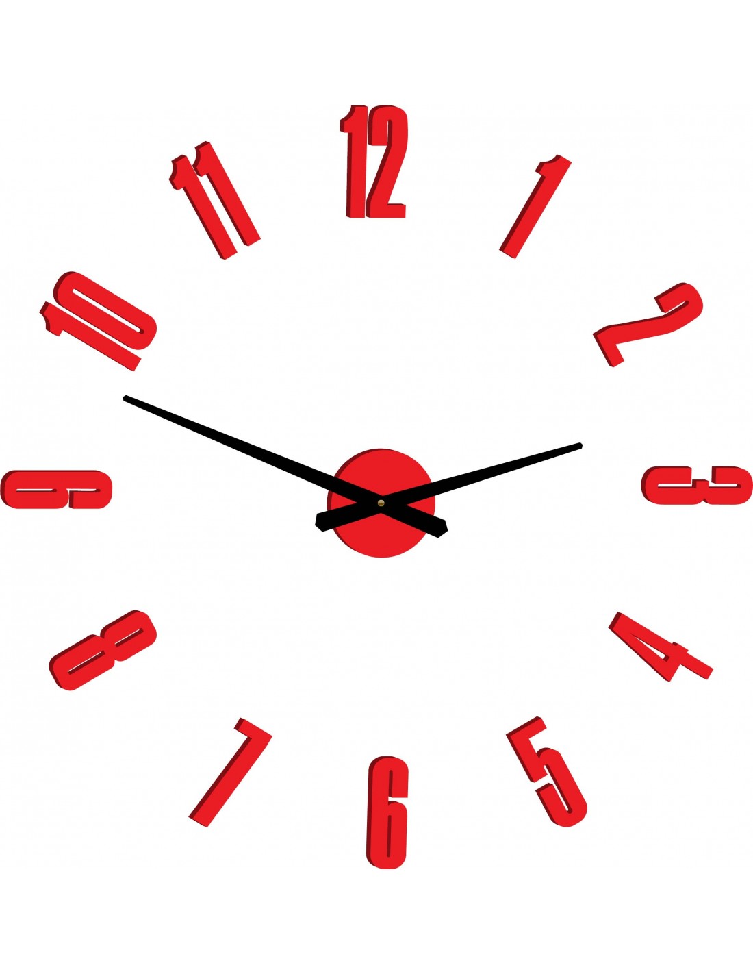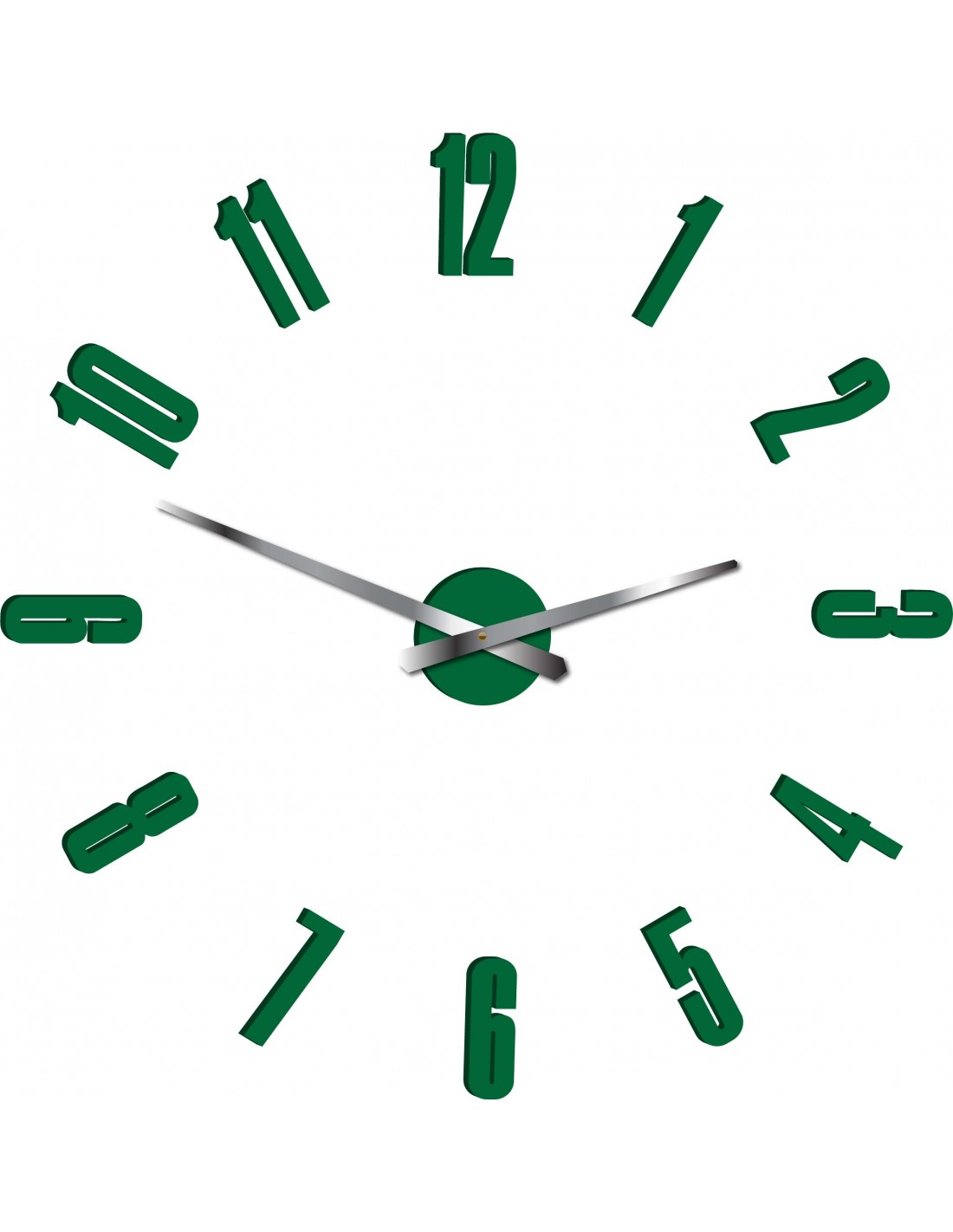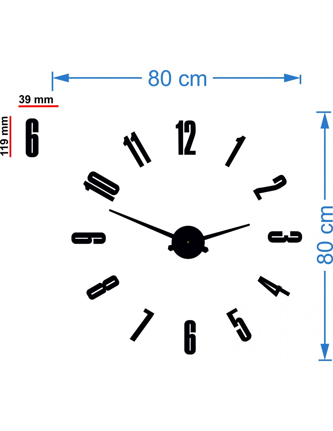 Wymiary naklejki: 800 x 800 mm, możliwość powiększenia do 1300 x 1300 mm. Wymiary mechanizmu zegarowego: 100 x 100 mm. Długość wskazówek: 30 - 40 cm.