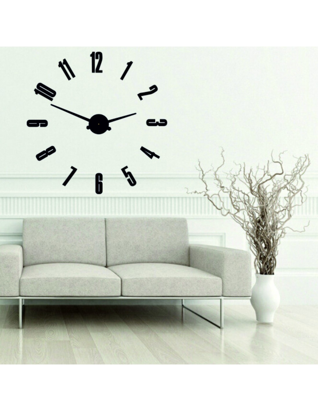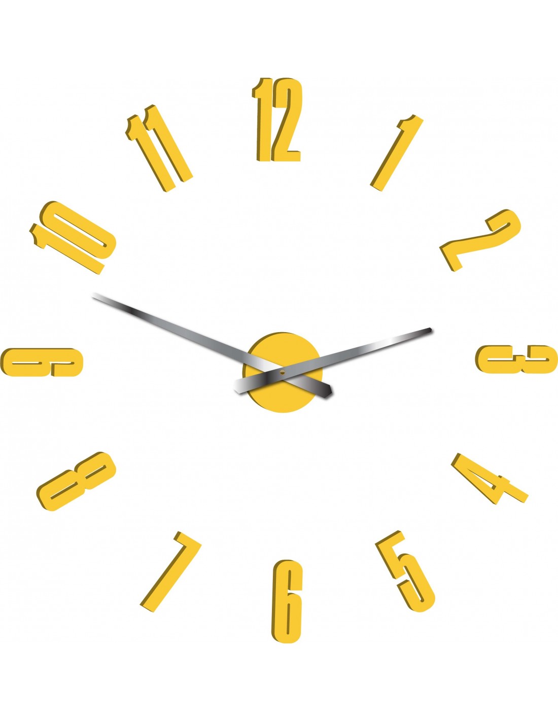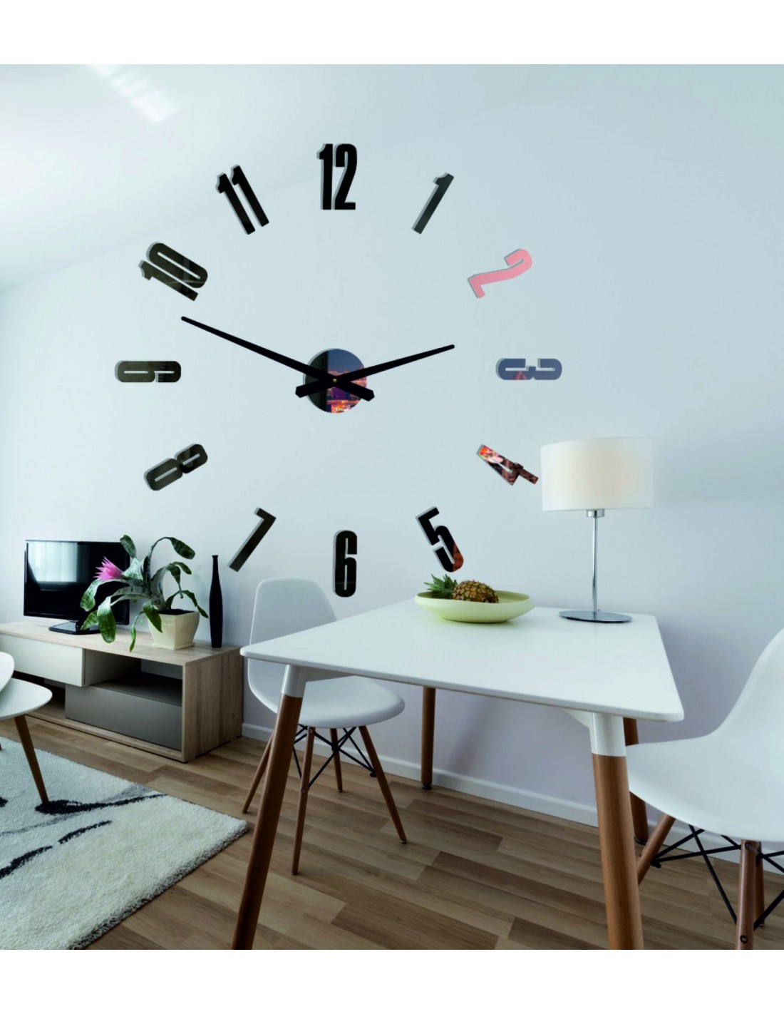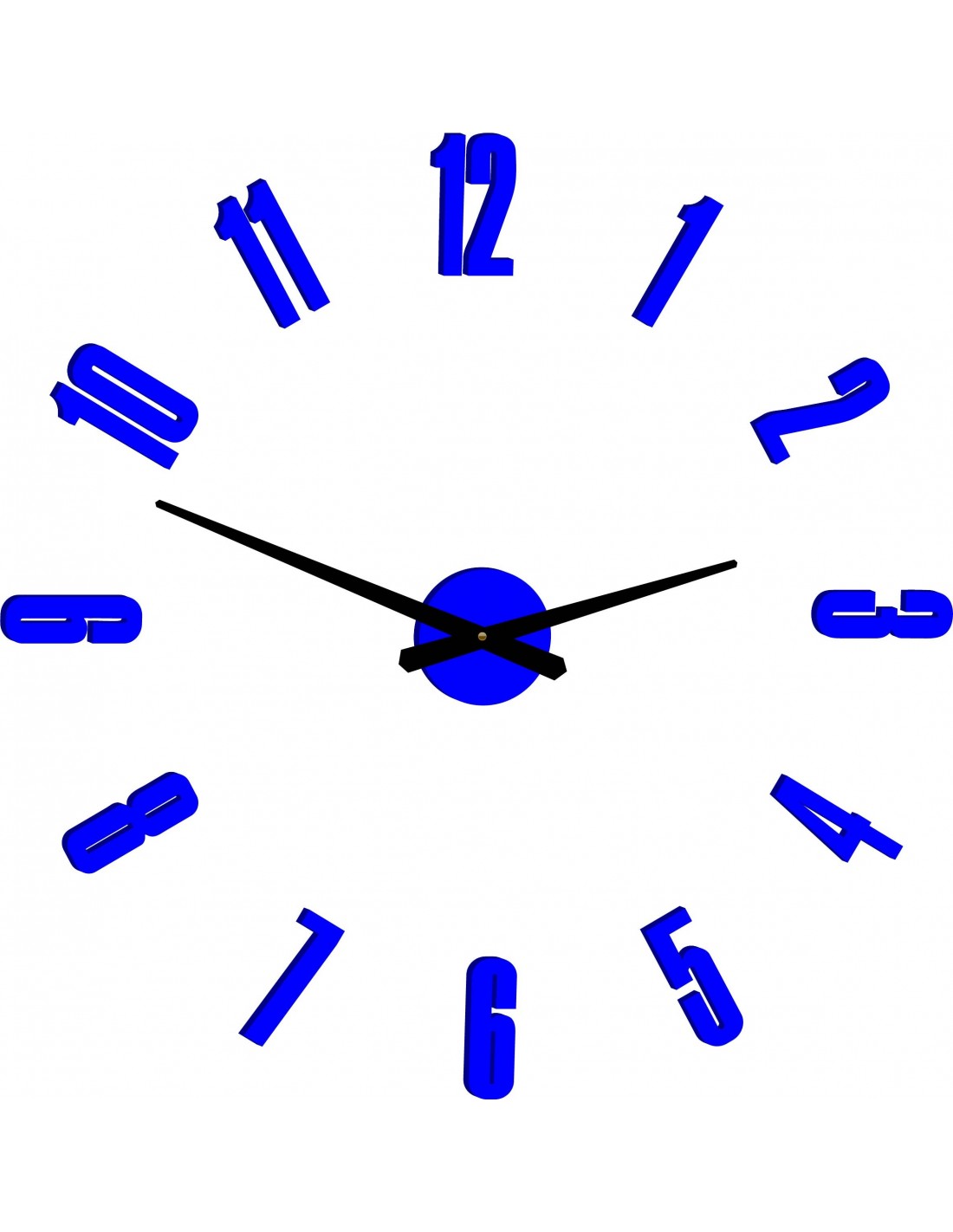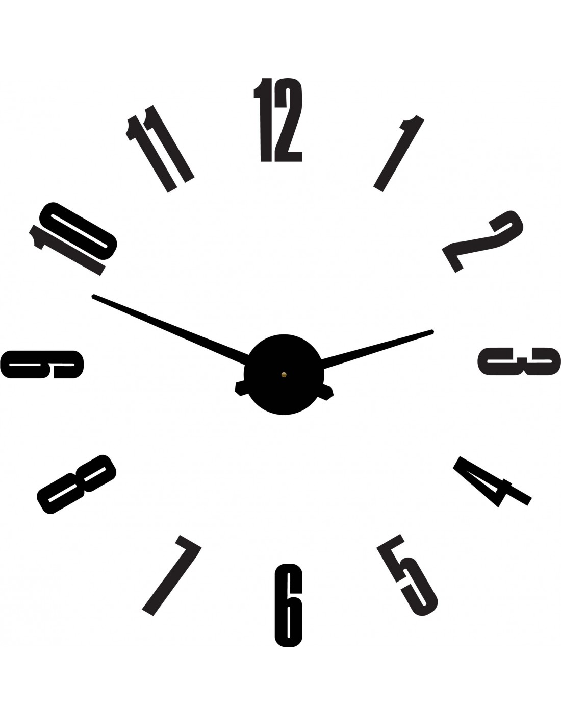 Wymiary naklejki: 800 x 800 mm, możliwość powiększenia do 1300 x 1300 mm. Wymiary mechanizmu zegarowego: 100 x 100 mm. Długość wskazówek: 30 - 40 cm.